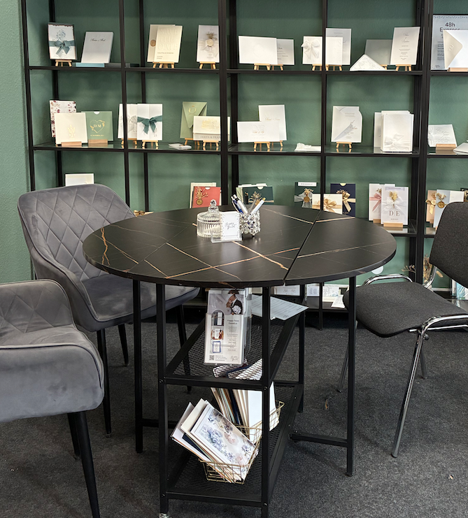 Wir senden dir gerne Musterkarten mit hochwertigen Papiersorten und exklusiven Veredelungen wie Letterpress und Folienprägung zu. Schreibe uns einfach eine E-Mail mit deiner Versandadresse und deinem Wunschmodell.