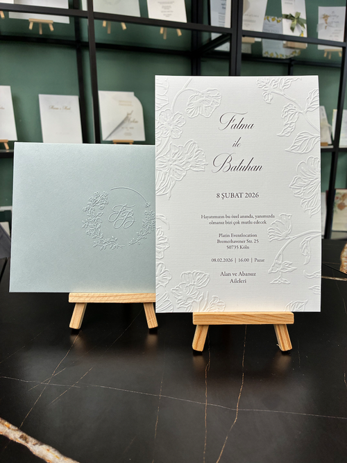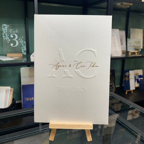 Unsere Hochzeitseinladungen zeichnen sich durch edle Veredelungen aus: Die Goldfolienprägung verleiht Ihren Namen und Initialen einen luxuriösen Glanz, während die Blindprägung durch ihre subtile Eleganz besticht.